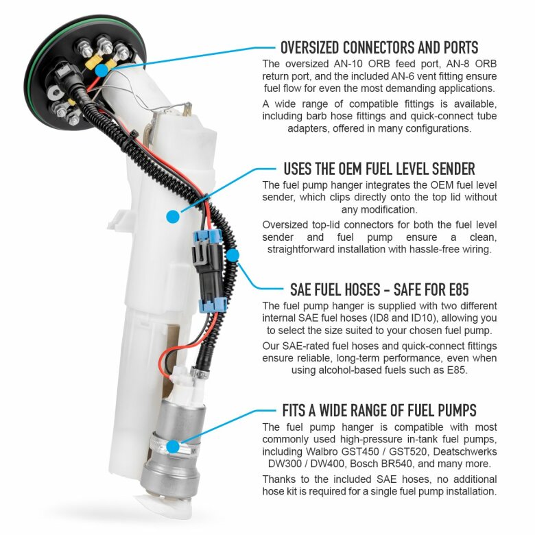 The fuel pump hanger is designed to support popular high-pressure aftermarket fuel pumps such as Walbro GST450 and GST520, Deatschwerks DW300 and DW400, Bosch BR540, and many more. With the two included internal fuel hoses, no additional hose kit is required when running a single aftermarket fuel pump setup.