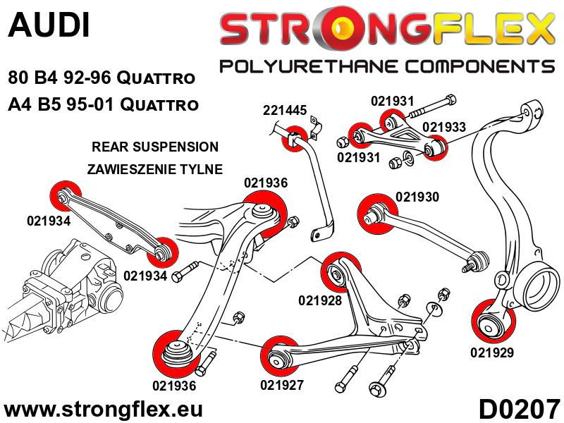 KIT ID: 026215A Namn Engelska: Rear subframe bush kit SPORT Passar följande modeller: Audi 80 B4 92-96 Quattro Audi A4 B5 95-01 Quattro Produkten inkluderar: 4x 021936A Tuleja tylnego wózka SPORT Pcs / Kit: 4 Bildbeskrivningar:D0207 Hårdhet: 90ShA Material: POLIURETAN (PUR/PU) Monteringsfett skickas med alla produkter!.