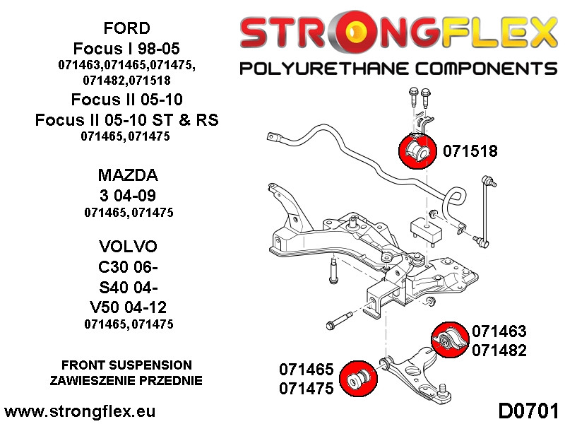 Artikelnummer: 071475A Namn Engelska: Front wishbone front bush - bolt 14mm SPORT Passar följande modeller: Ford Focus MK I 98-05 Ford Focus MK I 98-05 ST&RS Ford Focus MK II 05-10 Ford Focus MK II 05-10 ST&RS Ford Focus MK III 10- Ford Focus MK III 10- ST Mazda 3 04-09 Volvo C30 06- Volvo S40 06- Volvo V50 04-12 Antal/Prod: 1 Åtgång/Bil: 2 Noteringar This bush uses a 14mm bolt, for 12mm bolt use 071465 Hårdhet: 90ShA Material: POLYURETHANE (PUR/PU) Monteringsfett skickas med alla produkter!.