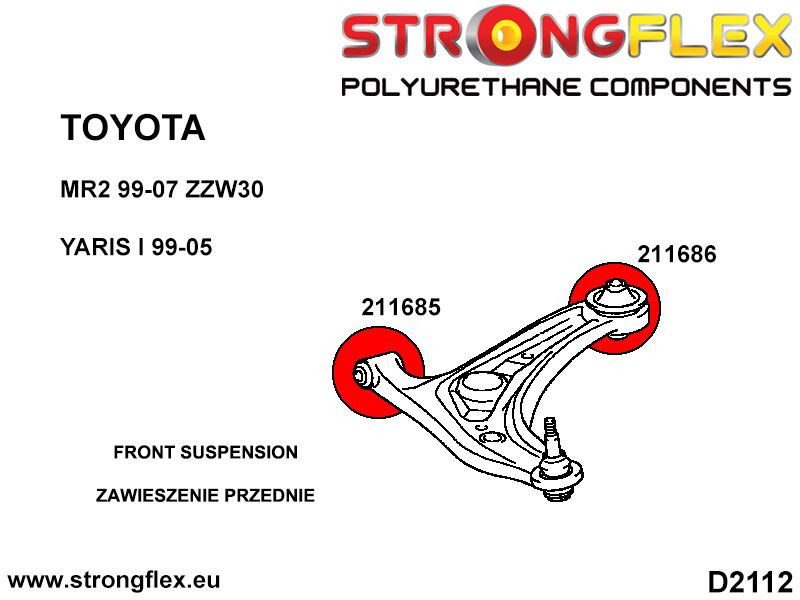 Ref: 211685A Front wishbone front bush SPORT Passar följande modeller:Toyota MR2 ZZW30 99-07Toyota Yaris I 99-05OEM nummer nummer:48068-1917648069-19156 Antal/Prod: 1 Åtgång/Bil: 2 Bildbeskrivningar:D2112 Hårdhet: 90ShA Material: POLYURETHANE (PUR/PU) Monteringsfett skickas med alla produkter! .