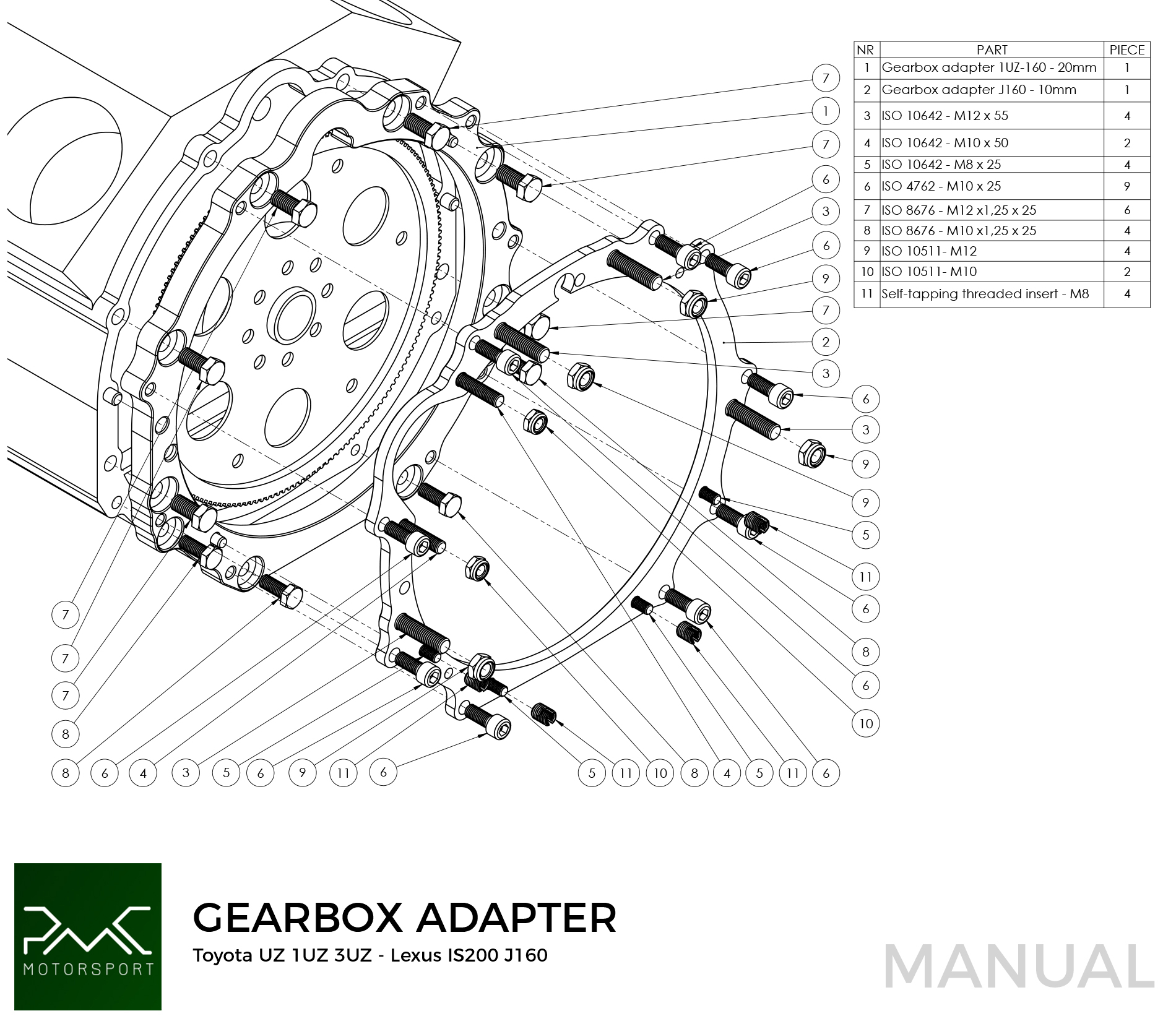 PMC Motorsport adapter kit Toyota Lexus V8 UZ 1UZ 3UZ - Toyota Altezza / Lexus IS200 J160 Aisin AZ6 1G-FE (first gen) - 240mm / 9.