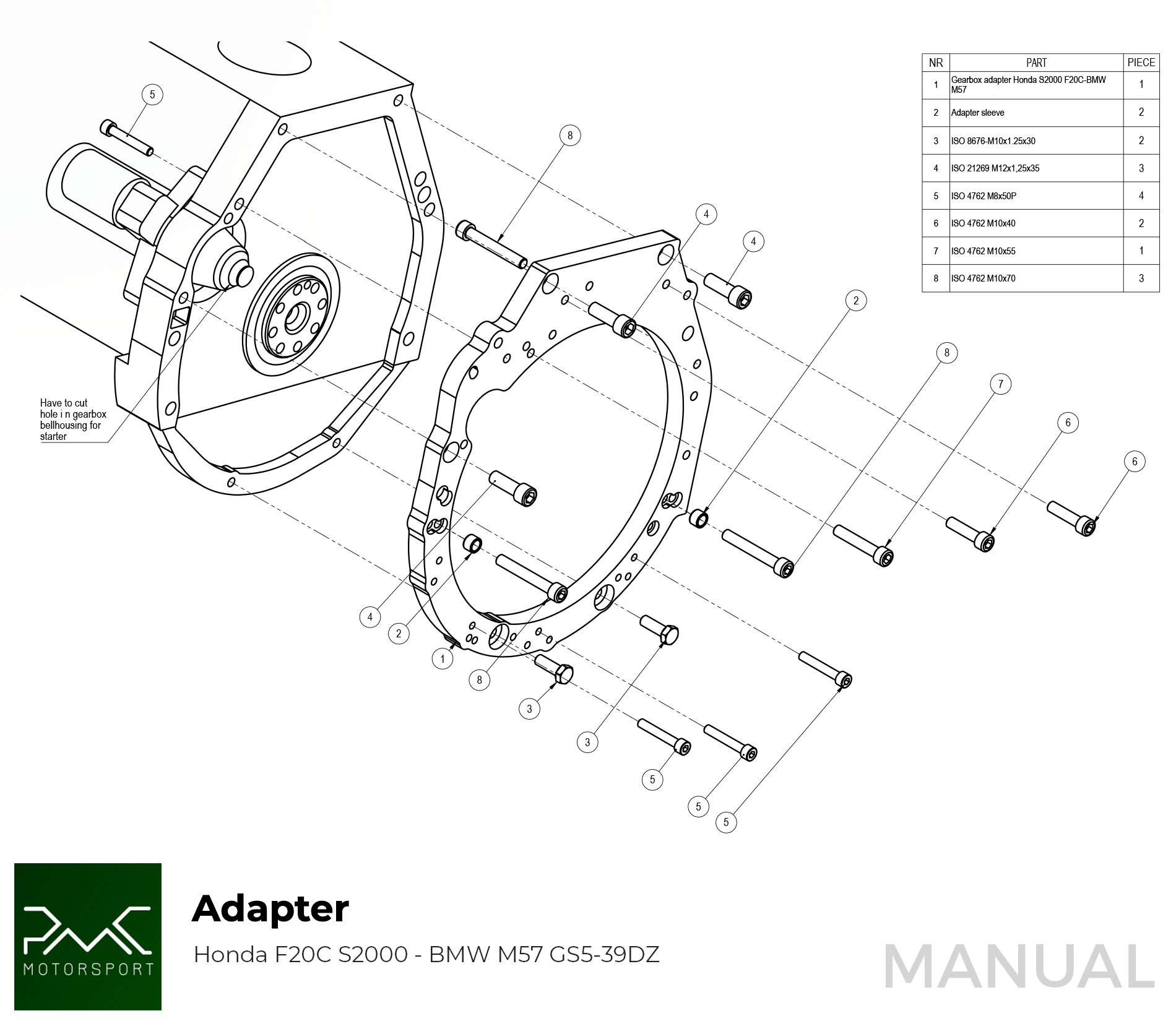 PMC Motorsport adapter kit Honda F20C F22C1 (S2000) - BMW M57 ZF GS5-39DZ / BMW E46 S54 M3 GETRAG 420 - 240mm / 9.
