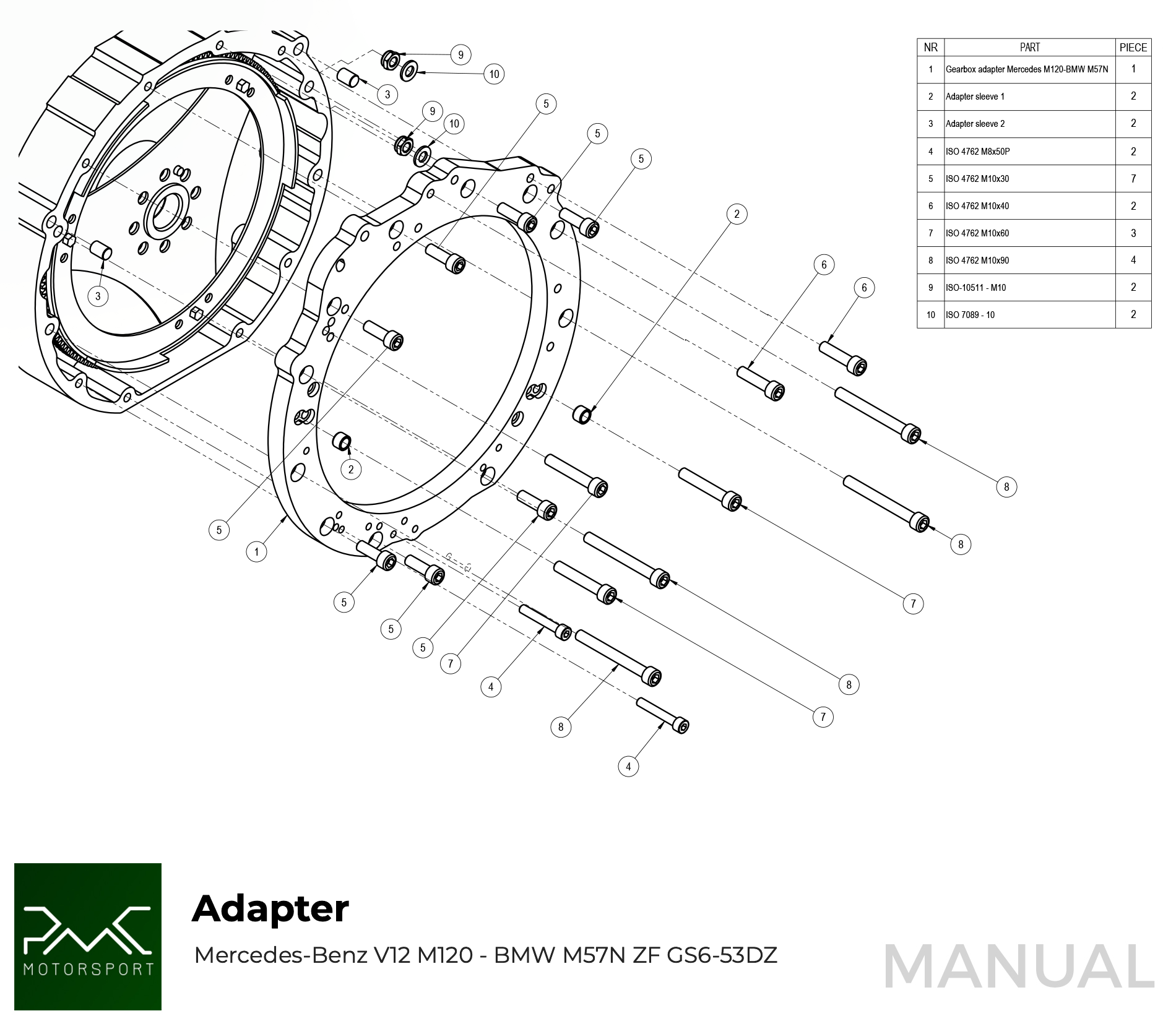 PMC Motorsport adapter kit Mercedes-Benz V12 M120 - BMW M57N M57N2 GS6-53DZ HGU HGK / BMW N54 GS6-53BZ - 240mm / 9.