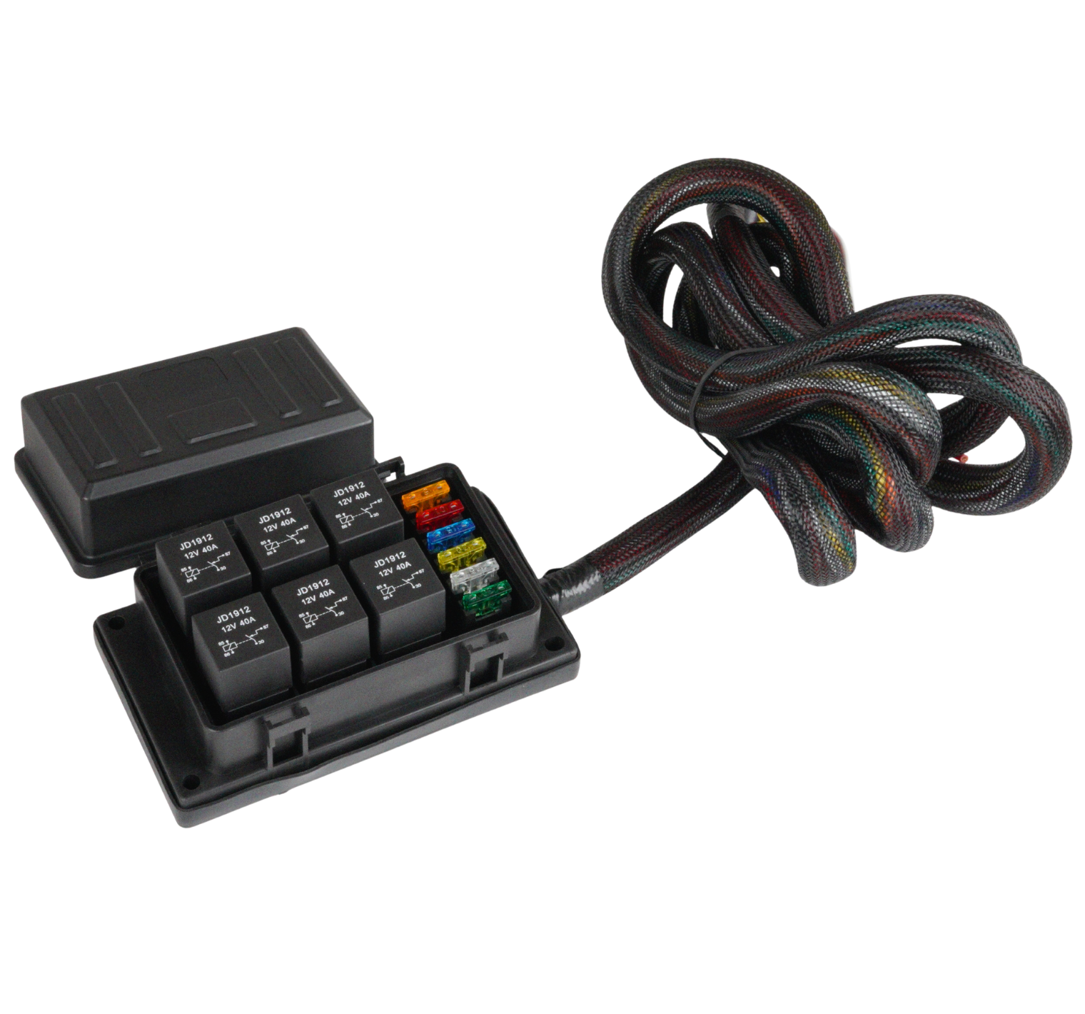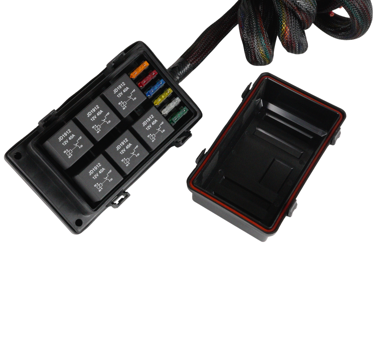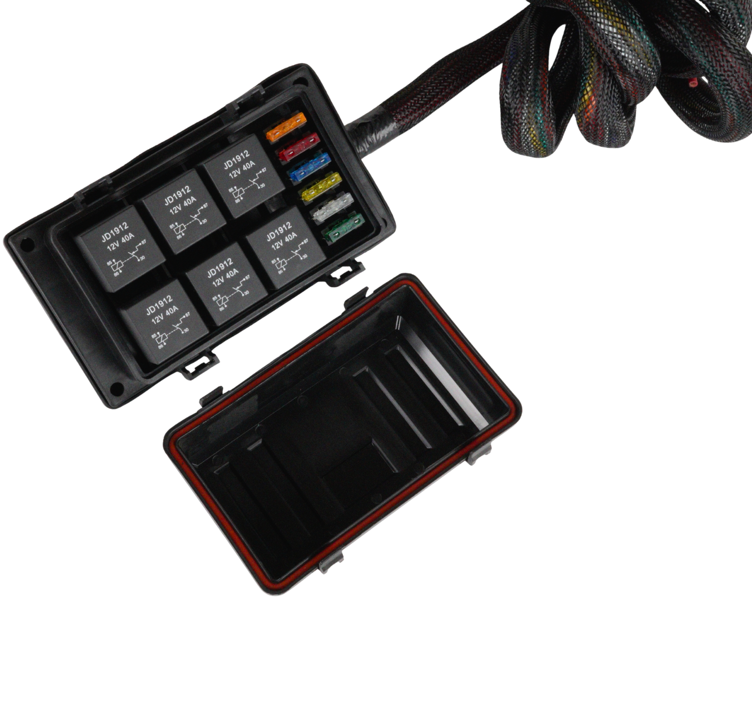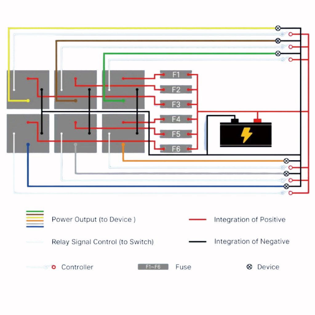 RB6-W är en universal relä och säkringscentral som kan kopplas till ECU eller switch för att enkelt styra förbrukare så som: