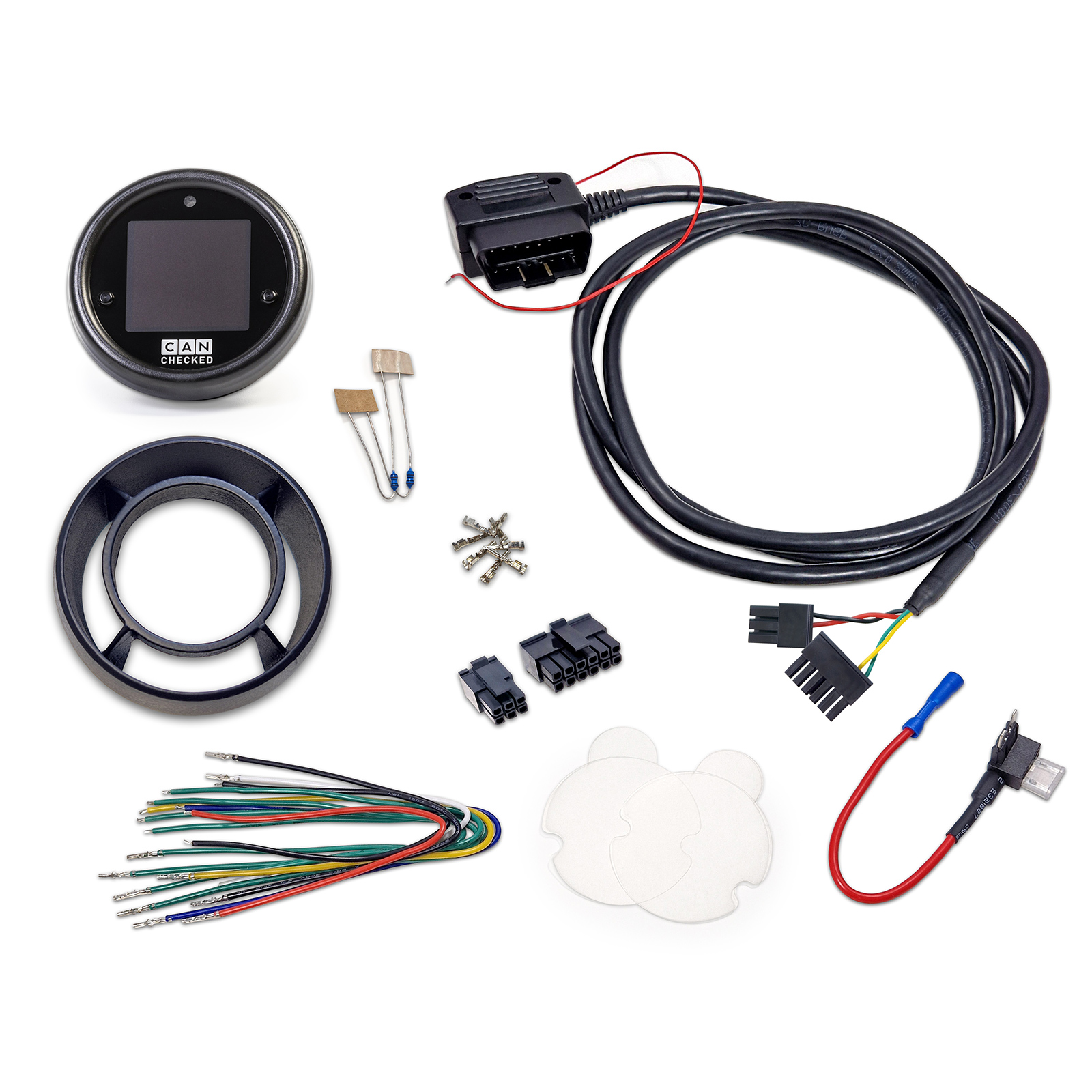 - Different coloured pre-assembled connection cables (length: 20 cm, intended use: power supply, Can Bus, analogue inputs, 5V, sensor ground)