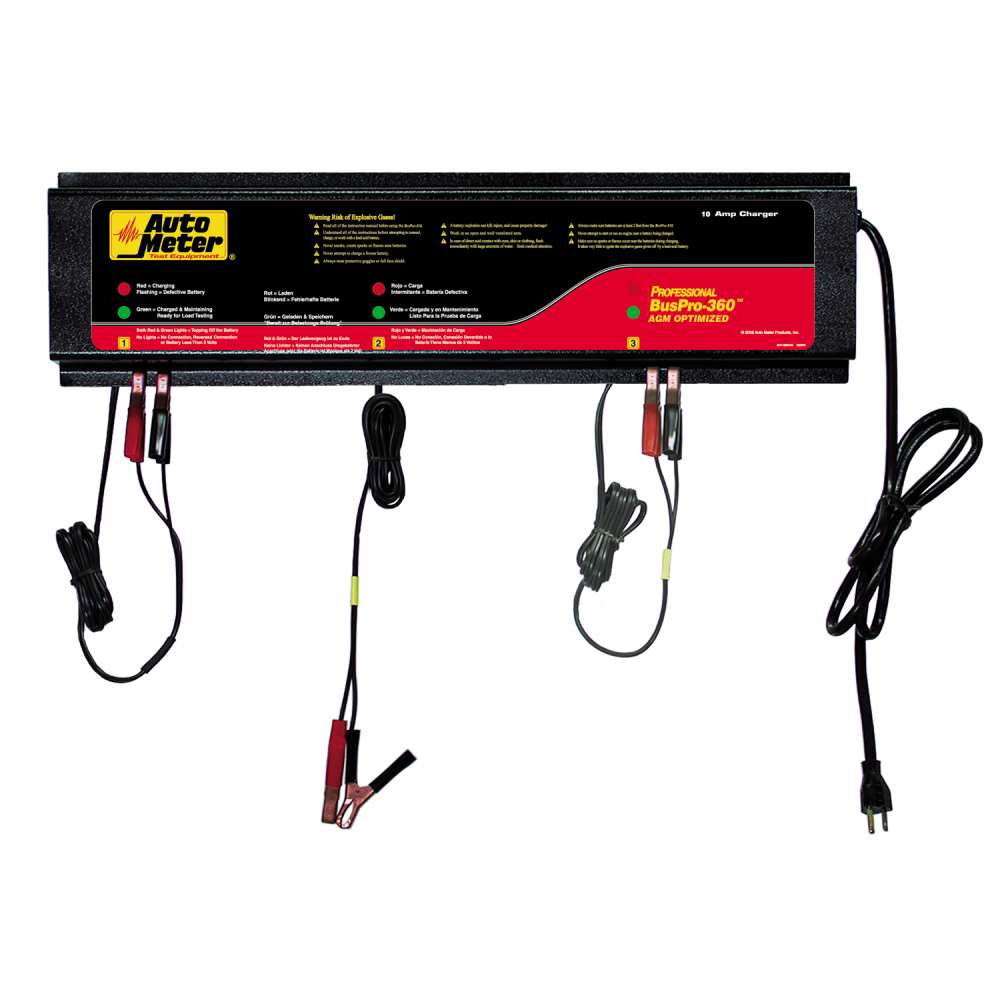 120 volt BusPro-360 model multi-station 5 amp smart chargers that are specifically optimized for use with AGM (Absorbent Glass Mat) Batteries. These completely automatic charging stations are ideal for fleets, shops, and parts stores due to the advanced new circuitry designs and controls specifically designed for the proper and safe charging and maintenance of AGM batteries which makes overcharge impossible. The flexible BusPro system has three 5 amp transformer stations which can be split out to double the charger’s capacity at a lower 2.5 amp charge rate if bringing up the charge on the batteries more slowly is desired. The charging current provided by each station is also micro-controlled and helps remove sulfation from batteries connected to the BusPro-360 unit.