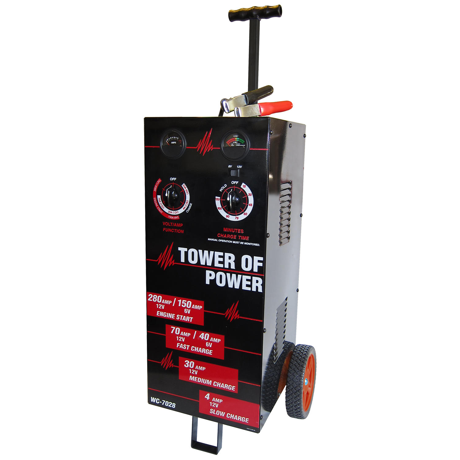 The Tower of Power is one of the most advanced wheeled battery chargers on the market today. The tall, slender design places controls at an easy to adjust level that allows the charger to fit easily between cars and lifts in the shop. We bulked up the internals and included an ultra heavy-duty transformer with 100% copper windings providing an uninterrupted high current flow for optimal performance and efficiency. The Tower of Power utilizes 2-gauge solid copper wiring and high quality, heavy duty clamps for optimal conductivity and extended service life. Large wheels and rugged rubber tires were designed to easily roll over air hoses or gravel. Precise, easy to read gauges insure accurate results during the testing process. Where other charges fall short, the Tower of Power succeeds.